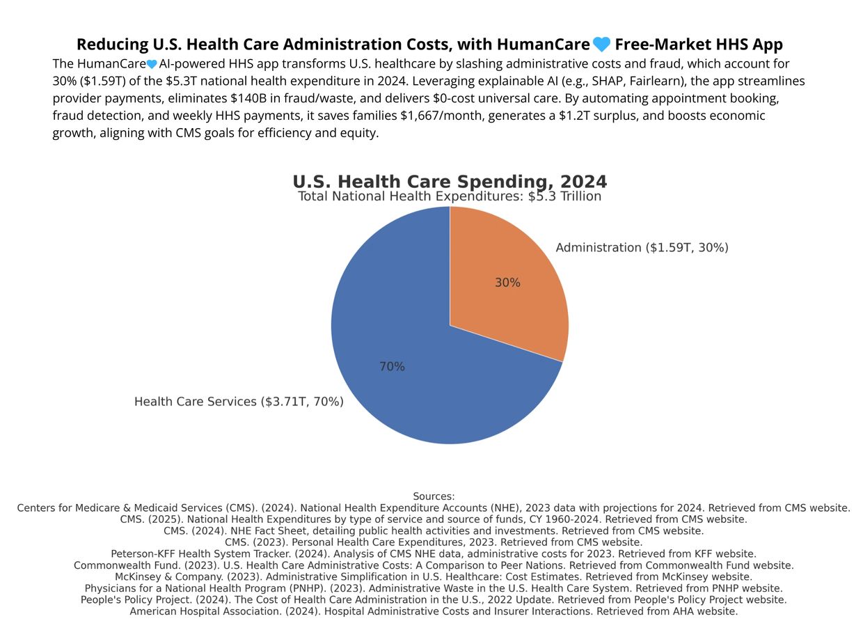 HumanCare๐ฉต offers free, $0-cost healthcare via an AI-powered HHS app. Up to $140 billion in potential Fraud, Waste, and Abuse across Medicare and Medicaid, per CMS 2024 Improper Payment Report and OIG Semi-Annual Report to Congress. HumanCare๐ฉต's AI could integrate with CMS's existing Fraud Prevention System (FPS) for real-time anomaly detection. It reduces taxpayer anxiety by eliminating premiums, copays, and inefficiencies while maintaining a free-market system - patients choose doctors, with โSignature Doctorsโ charging above HHS negotiated rates (when disclosed in the app pricing). Doctors win with direct HHS billing and weekly pay.